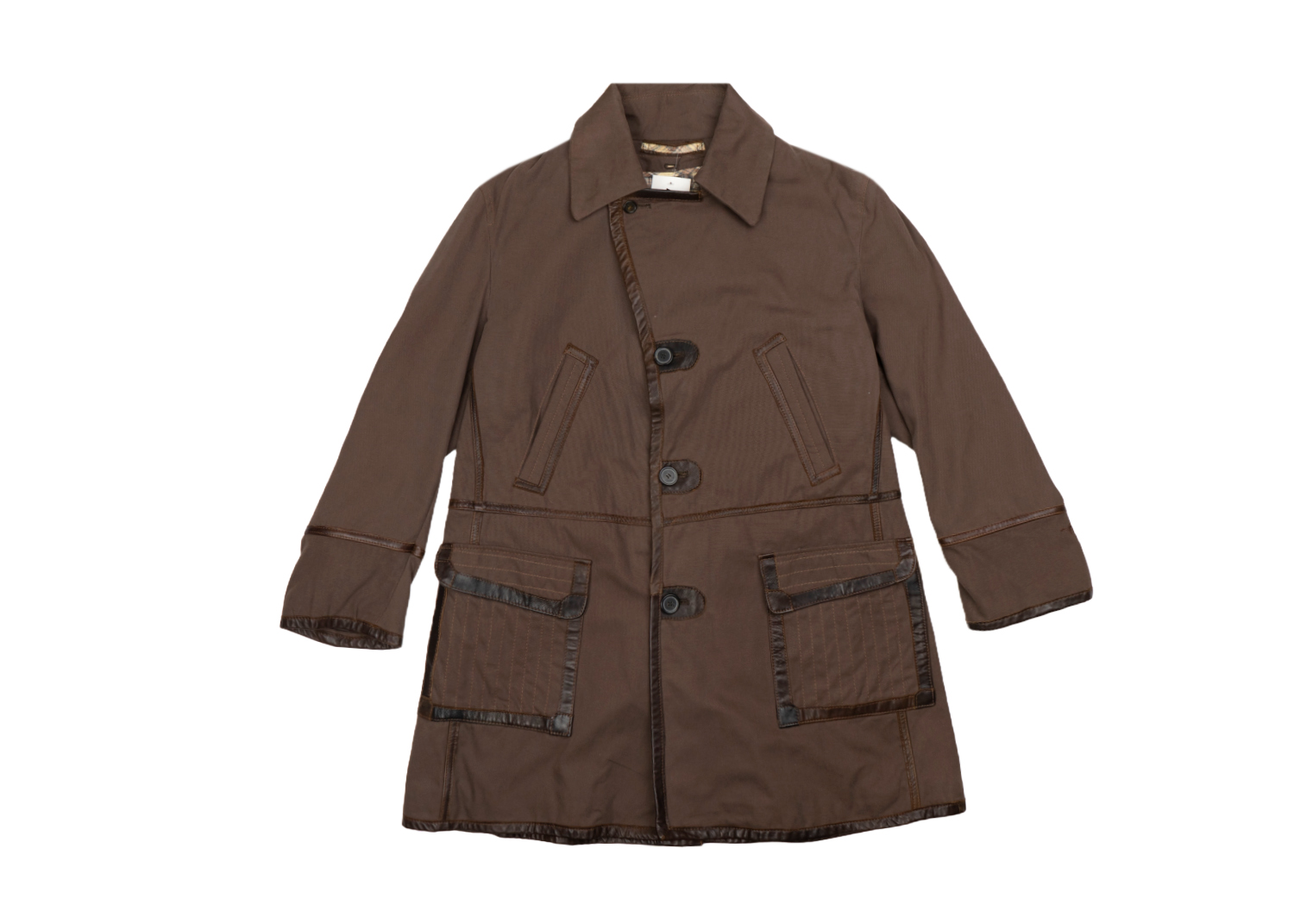 Пальто выполнено из плотного высококачественного хлопка с отделкой из натуральной кожи.